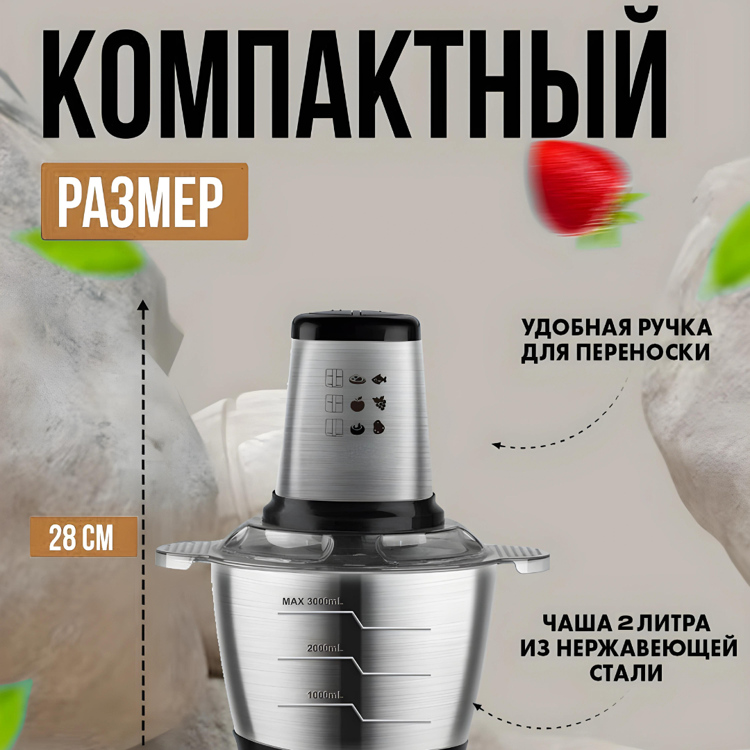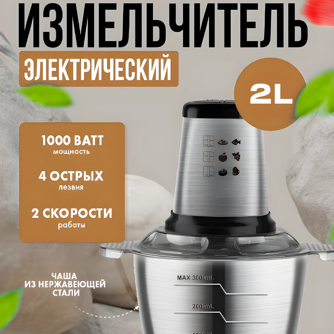 Металлический электрический кухонный измельчитель, емкость 2 литра. Как измельчитель молния, только лучше. Внутри 4 стальных лезвия на разных высотах. Мощность 1000 Вт. Две скорости измельчения. Полностью разборный для легкой очистки и комфортного использования. Металлическое соединение между мотором и лезвиями рассчитано для долговечной службы прибора. Работает так же, как блендер измельчитель. Быстро и легко измельчит, порубит, сделает фарш, пюре или соус из любых пищевых продуктов. На металлической чаше с внешней стороны есть отметка максимальной загрузки для измельчения мяса. Остальные продукты можно закладывать в большем количестве